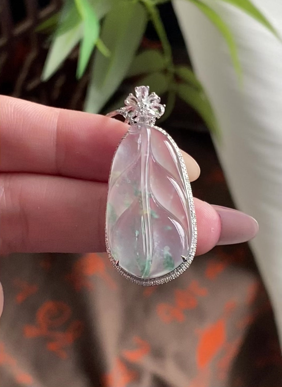 18k金钻镶冰玻种飘花玉叶吊坠(yc195102)