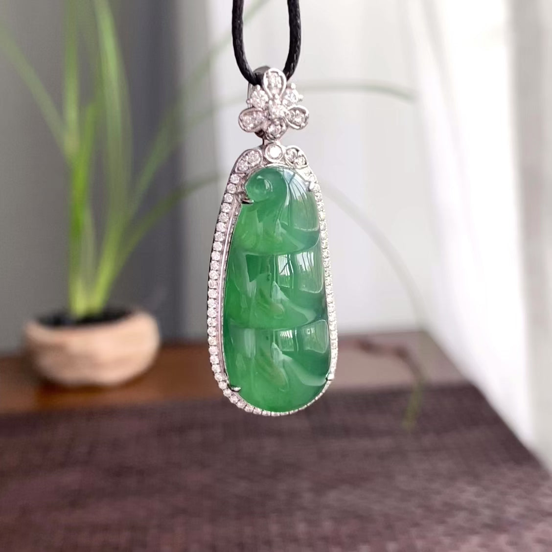 18k金钻镶冰种湖水绿福豆吊坠(yc250179)